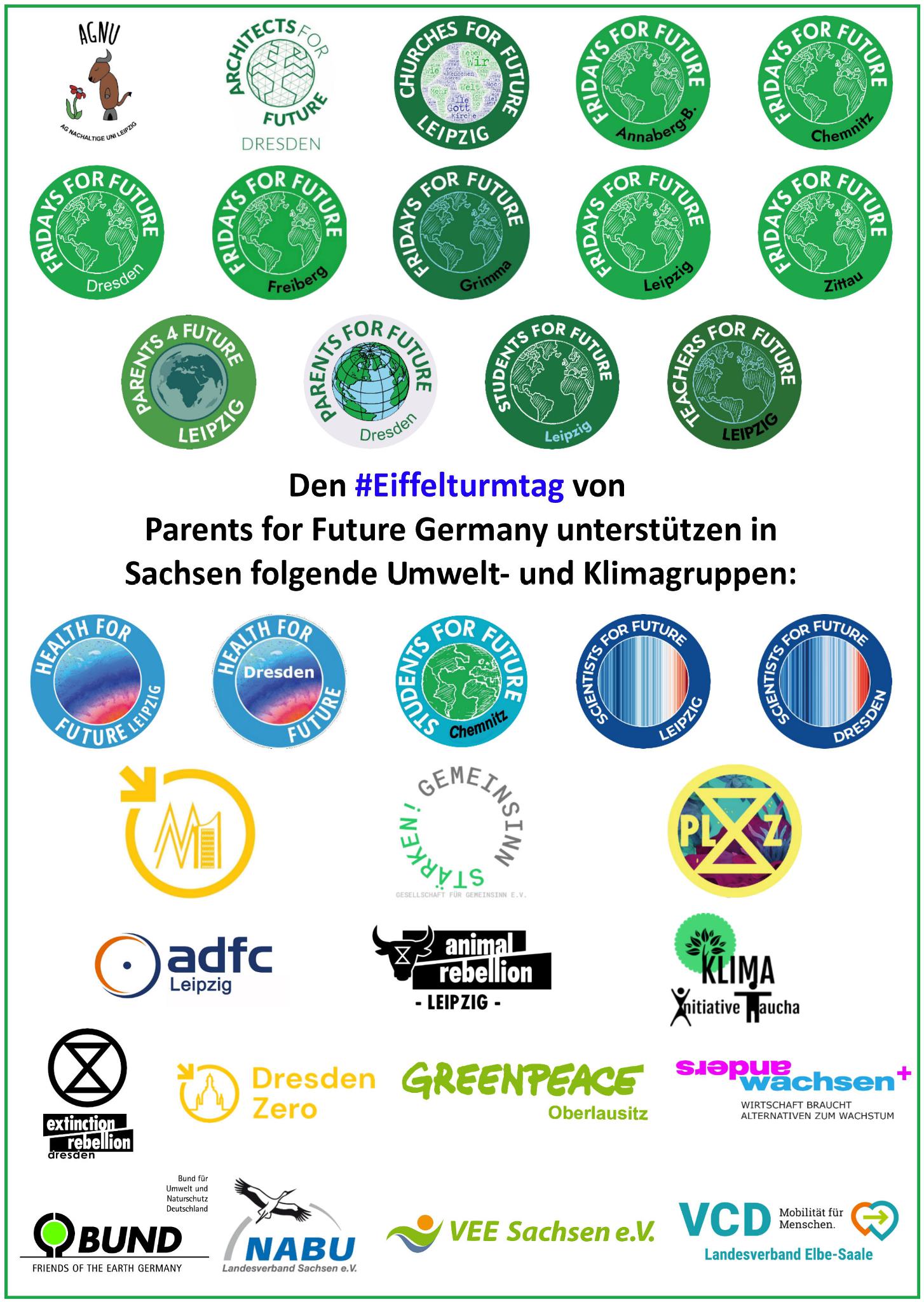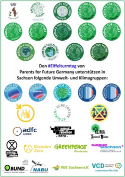Damit reiht sich Leipzig in verschiedene Aktionen in Sachsen ein. Insgesamt werden rund um den #Eiffelturmtag in acht sächsischen Wahlkreisen Eiffeltürme an 18 Abgeordnete des Deutschen Bundestages übergeben. Die Aktionen unterstützen sachsenweit über 30 Umweltund Klimagruppen aus allen Teilen des Freistaats (s. Bild).