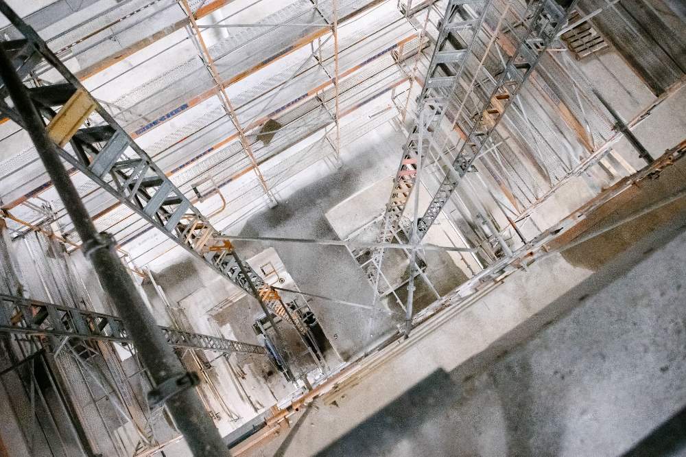 Auf der Baustelle sind gerade zahlreiche Gewerke mit ihren Arbeitern aktiv. Sie haben ebenfalls bereits die gesamte Alttechnik auf dem Dach beseitigt und die vorhandenen Bodenbeläge entfernt.