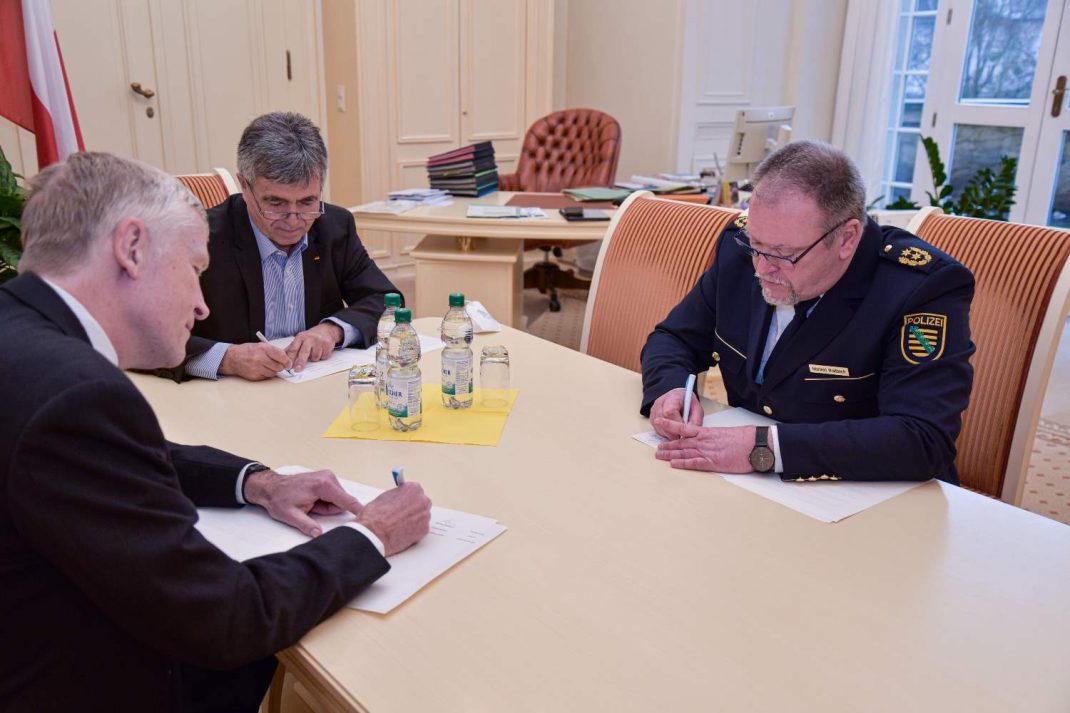 Der Leitende Oberstaatsanwalt der Staatsanwaltschaft Görlitz, Dr. Thomas Fresemann, der Polizeipräsident der Polizeidirektion Görlitz, Manfred Weißbach und der Landrat des Landkreises Bautzen, Michael Harig, unterzeichneten gestern die Kooperationsvereinbarung für das neue »Haus des Jugendrechts« in Bautzen.