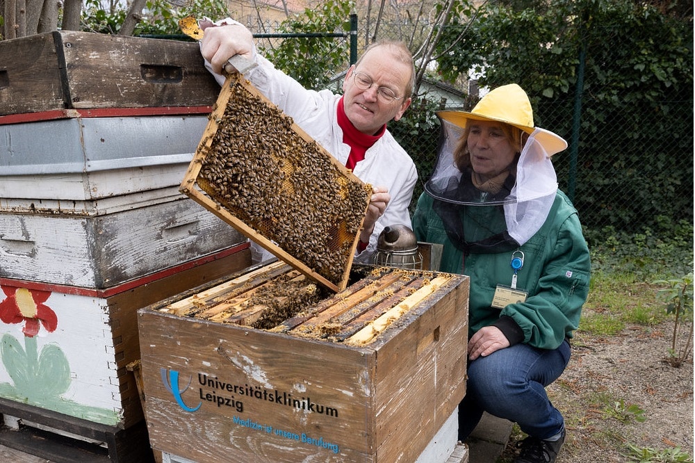 Ob der Honig auch Erkältungsverläufe positiv beeinflusst hat, ist nicht belegt – aber Fakt ist, dass den Bienen die Nachbarschaft zum UKL gut bekommt. „Die Völker haben sich tipptopp entwickelt und sind nach diesem Winter schon sehr stark“, berichtet Dr. Michael Hardt. Der Imker betreut die Bienenstöcke und stellt sicher, dass die Bienen gut versorgt sind. „Weil im Moment aber noch nicht genügend Blüten und damit Nahrungsquellen da sind, muss der Wintervorrat kontrolliert werden, damit die Bienen gut über die nächsten Wochen kommen“, so Hardt.