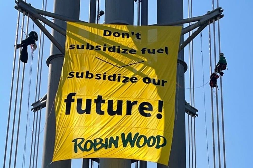 ROBIN WOOD-Aktivist/-innen kletterten zudem am Morgen auf den Leipziger Messeturm und entrollten dort oben ein Banner mit der Aufschrift: „Don’t subsidize fuel, subsidize our future!“ („Subventioniert keine Treibstoffe, sondern unsere Zukunft“). Beim Weltverkehrsforum, das bis Freitag auf dem Leipziger Messegelände stattfindet, treffen Vertreter/-innen der Transportindustrie auf Minister/-innen aus 63 Mitgliedsländern, um sich über die Zukunft der globalen Verkehrspolitik auszutauschen.