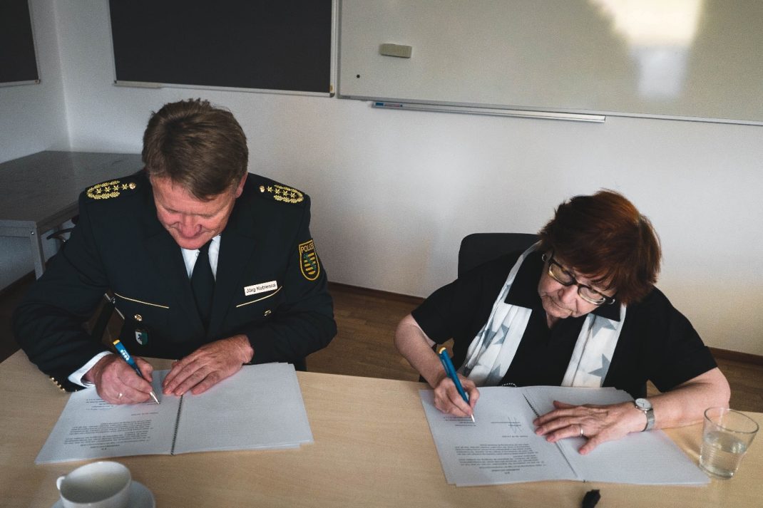 Am 28. Juni 2022 unterzeichneten Frau Dr. Nora Goldenbogen und Herr Landespolizeipräsident Jörg Kubiessa im Sächsischen Staatsministerium des Innern in Dresden eine Kooperationsvereinbarung. Ein zentraler Punkt der Vereinbarung ist die Unterstützung bei der polizeilichen Aus- und Fortbildung.