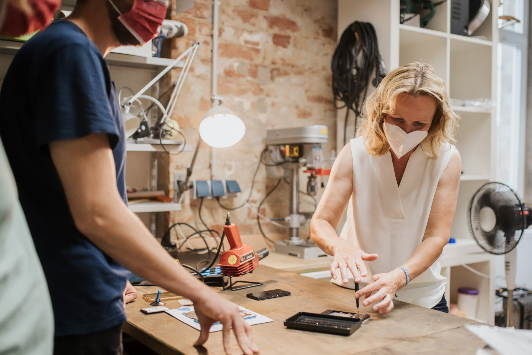 Auch die Reparaturexpert/-innen des Café kaputt äußerten sich Frau Lemke gegenüber mit konkreten Forderungen in Bezug auf ein „Recht auf Reparatur“. Um diese Wünsche zu veranschaulichen wurde ein defektes Smartphone geöffnet, was deutlich machte, welchen Hindernissen man bei gängigen Reparaturen begegnet. Eine übergreifende Forderung lautet, dass jede/r immer in der Lage sein soll, ein defekte Produkt entweder selbst zu reparieren, oder von einem Anbieter seiner Wahl reparieren zu lassen.