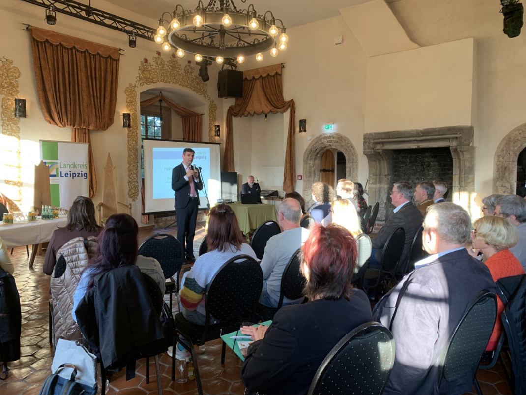 Ein Abend ganz unter dem Motto der Regionalität: Rund 40 Gäste folgten am 21.09.2022 der Einladung von Landrat Henry Graichen ins Schloss Trebsen. Dieser stich in seiner Begrüßung die Bedeutung regionaler Erzeugung und Vertrieb als wichtiges Identitätsmerkmal einer Region heraus. Auch Schlossherr Jochen Rockstroh, selbst regionaler Erzeuger, hieß die Gäste im historischen Festsaal willkommen.