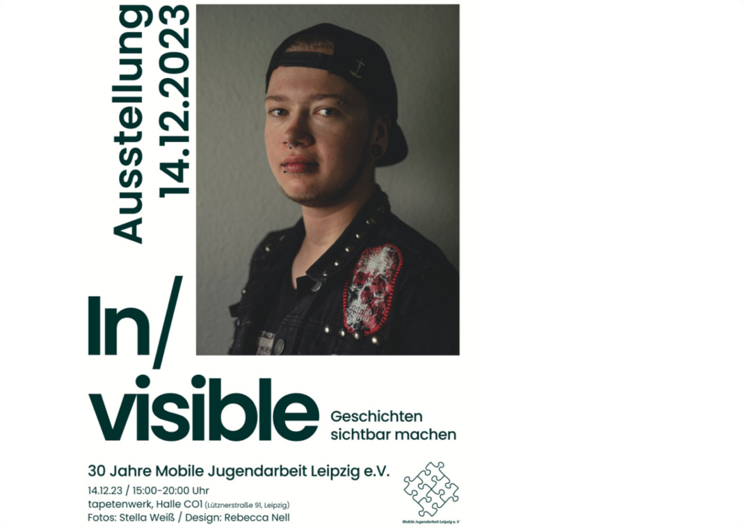Anlässlich seines 30-jährigen Bestehens präsentiert der Verein Mobile Jugendarbeit Leipzig e.V. die Porträt-Ausstellung „In/visible“ – Geschichten sichtbar machen. Diese ist am Donnerstag, 14. Dezember 2023 von 15 bis 20 Uhr im Tapetenwerk (Halle C01), Lützner Straße 91, 04177 Leipzig zu sehen