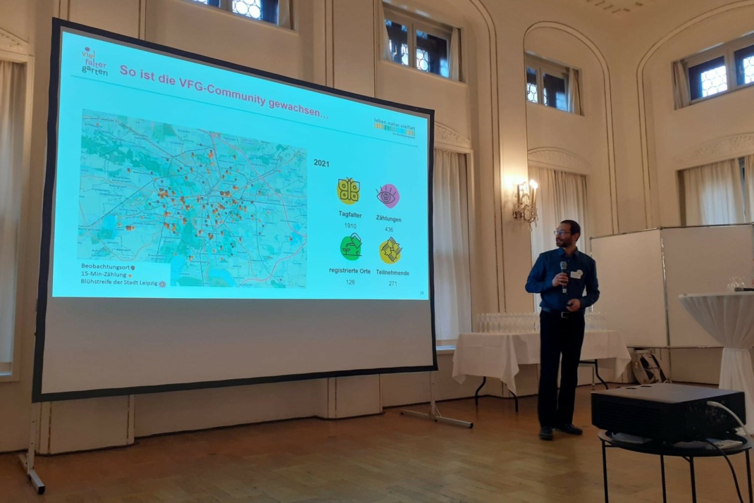 Das VielFalterGarten-Projekt, das sich für den Schutz von Schmetterlingen in Leipzig einsetzt, feierte seine vierjährige Projektlaufzeit mit einer Abschlusskonferenz. Über 80 Menschen nahmen an der Veranstaltung am vergangenen Freitag in der alten Handelsbörse in Leipzig teil. Das Projekt wurde gefördert im Bundesprogramm Biologische Vielfalt durch das Bundesamt für Naturschutz mit Mitteln des Bundesumweltministeriums.