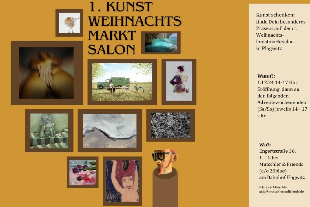 Die kommenden drei Adventswochenenden hat der künstlerische Weihnachtsmarkt im 1. OG des Bahnhofsgebäudes in Plagwitz samstags und sonntags jeweils von 14 bis 17 Uhr geöffnet. Der Eintritt ist frei, es gibt Warmes und Leckeres zum kleinen Preis. Bezahlt werden kann mit Karte, PayPal oder bar. Die Salon-Gründerin Anja Mutschler ist vor Ort und in der Regel auch einige der Ausstellenden aus der Künstler-Community von Mutschler & Friends.