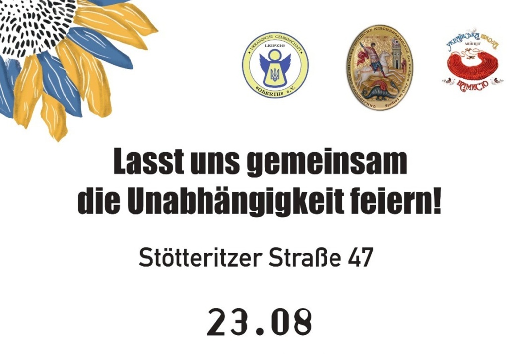 Die ukrainische Samstagsschule „Namysto“, die ukrainische griechisch-katholische Gemeinde in Leipzig sowie die Ukrainische Gemeinschaft Leipzig „Oberih“ e.V. zu Leipzig laden Sie recht herzlich ein, gemeinsam mit unseren Freunden den 34. Jahrestag der ukrainischen Unabhängigkeit zu feiern. Dazu haben wir uns ein interessantes und abwechslungsreiches Programm für jedermann überlegt: