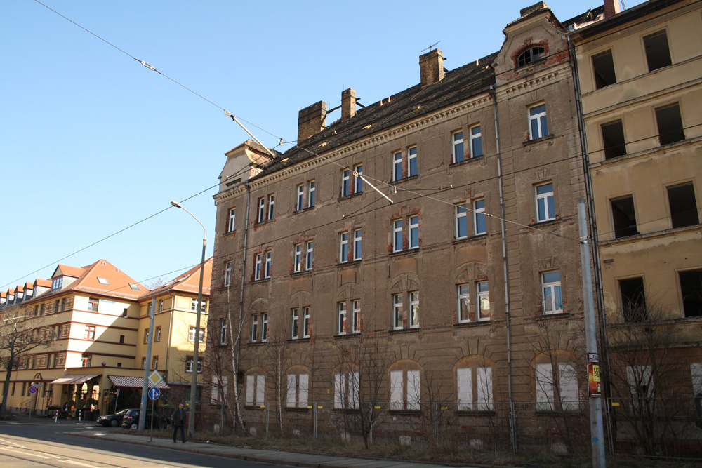 “Im Besitz der Stadt ist beispielsweise der Komplex Witzgallstraße 18, Riebeckstraße 37-47 und Stötteritzer Straße 43, die ehemalige ‘Zweiganstalt I’ des Johannishospitals, in Reudnitz. Sechs der sieben Gebäude wurden im Jahr 2012 zum Abbruch vorbereitet, dieser jedoch bis dato nicht durchgeführt. Das Liegenschaftsamt hält weiterhin an den Abbruchplänen fest. War die Vernichtung kommunalen Wohnraums schon 2012 kaum verständlich, so ist sie Anfang 2015 völlig absurd. Die Sanierung der Gebäude wäre mit 400.000 bis 500.000 Euro pro Haus möglich, zumal die Kosten für den Grunderwerb wegfallen. Das große, unzerstörte Eckhaus Witzgallstr. 18 könnte sogar zügig und deutlich günstiger wieder saniert und in Betrieb genommen werden. Mit dem weiteren Festhalten an den Plänen zum teuren Abbruch und anschließenden Verkauf der Flächen ergibt sich nach dem Verkauf der Friederikenstraße 37 in Dölitz 2013 (2014, d. Red.) aus städtischem Eigentum ein weiterer Fall, in dem das Handeln des Liegenschaftsamts augenscheinlich gesamtstädtischen Interessen zuwider läuft.”
