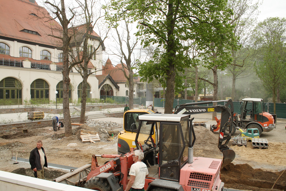 Am Mittwoch, 6. Mai, durften die Leipziger Journalisten schon einmal mit Dr. Jörg Junhold über die Baustelle spazieren. Es wird nach wie vor mit Hochdruck gearbeitet. “Wir werden die verbleibenden drei Wochen unbedingt noch brauchen”, sagt Junhold. Am 29. Mai sollte das Wichtigste geschafft sein. Denn dann findet um 11 Uhr im Großen Saal die feierliche Eröffnung der Kongresshalle im Rahmen des Leipziger Stadtjubiläums statt. Und ab 14 Uhr dürfen auch die Bürger gucken kommen, dann beginnt das große Bürgerfest, zu dem auch ein Teil der Pfaffendorfer Straße gesperrt werden soll. Selbst dort waren am Mittwoch noch die Pflasterklopfer bei der Arbeit.