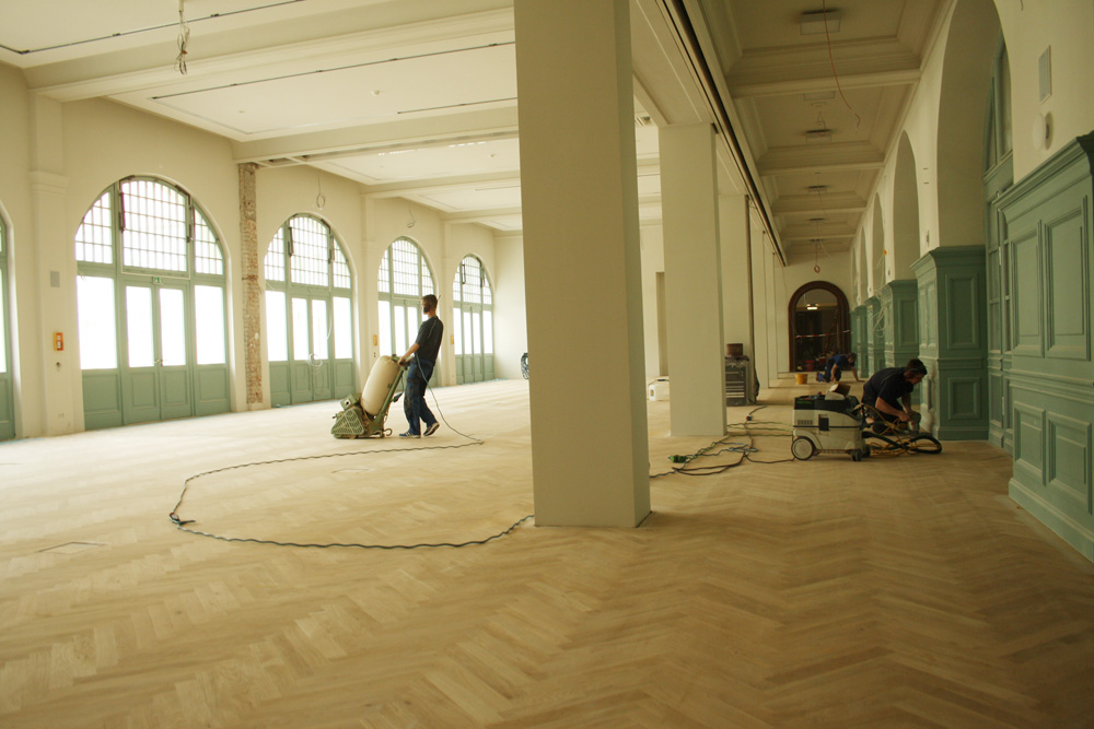 Überall waren noch die Maler am Werk. Und auch die Parkettleger kennen das wohl schon, dass alleweile ein paar neugierige Leute durchlaufen. Auch im Foyer des Saals war noch einer am Werk. Aber das frei gelegte kunstgeschmiedete Geländer aus der Eröffnungszeit musste Junhold noch zeigen. Es war eigentlich nie weg, in DDR-Zeiten aber einfach mit Holz ummantelt worden. Als man die Verschalung abnahm, war das Staunen entsprechend groß. Die wiedergefundene Jugendstiltreppe wird wohl bei vielen Besuchern noch für Staunen sorgen.