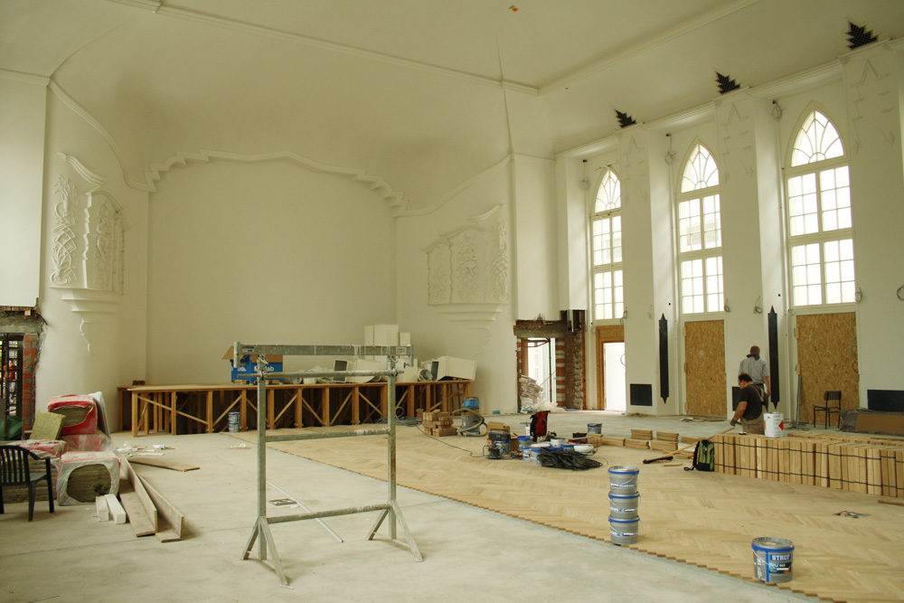 Dasselbe hinter der Kongresshalle im künftigen Freisitz. Selbst die Terrasse war noch in Arbeit, an den Treppen wurde noch gebaut, Kabel verlegt. In den ebenerdigen Sälen waren vor allem die Parkettleger bei der Arbeit. Der alte Weiße Saal, in dem einst das Theater der Jungen Welt spielte und der noch im Sommer 1989 Opfer eines Brandes wurde, strahlt fast schon wieder in alter Schönheit. Einer Schönheit, die er die ganzen vergangen sieben Jahrzehnte nicht hatte. Die Stuckarbeiten sind schon fast alle wieder hergestellt, die Bühne nimmt wieder Konturen an. Und an den Pfeilern wird die Anbringung der alten/neuen Spiegel geprobt.