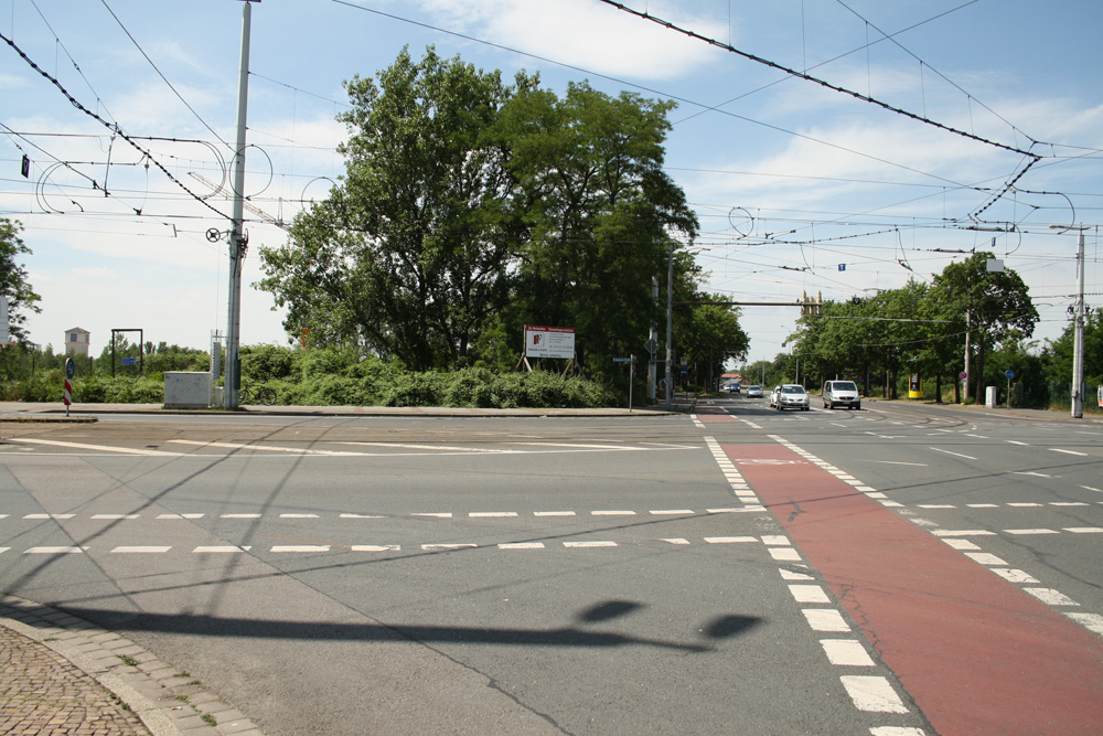 Dort verläuft auch der Straßenstummel, mit dem das Gesamtgelände zumindest angeschlossen ist. Was noch fehlt, ist die Verlängerung dieses Stummels im Bogen um das ganze Gelände herum unter der Brücke der Richard-Lehmann-Straße hindurch, so dass auch das derzeit brachliegende Gelände östlich vom MDR erschlossen werden kann.