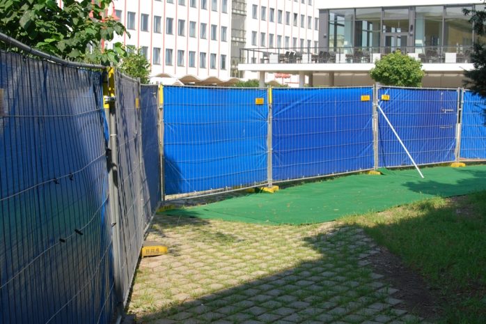 Ebenfalls ein noch etwas unausgegorener Plan – es existieren keine Tische in der Ernst Grube Halle, so dass die Speisen am Boden oder auf den Liegen sitzend eingenommen werden müssten. Noch hofft man offenbar den Unibetrieb und die Unterbringung weitgehend getrennt halten zu können und hat mit Absperrbauten begonnen.