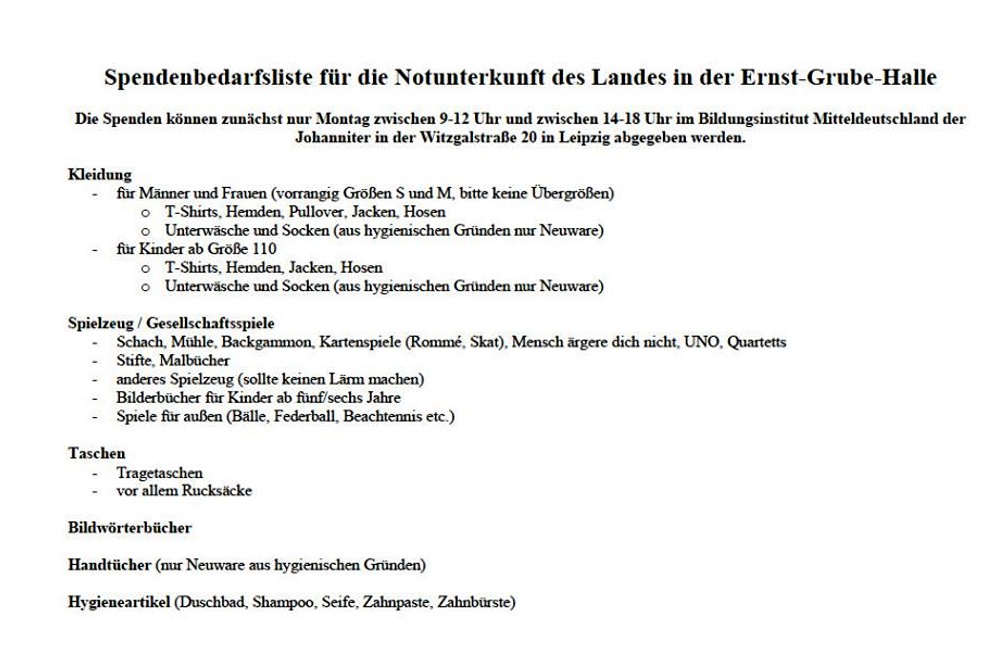 Die Gutwilligen hingegen warteten heute statt auf eine, wann auch immer kommende, Lösung aus der Politik eher auf die Liste der Dinge, die umgehend in der Ernst-Grube-Halle benötigt werden. Am späten Morgen gaben die Johanniter dann ihren Bedarf bekannt (siehe Auflistung am Ende). Diese Meldung verbreitet sich zur Stunde rasend schnell in den sozialen Netzwerken, die Hilfsbereitschaft ist offenbar sehr groß und es geht letztlich um ganz einfache Dinge, wie Handtücher, Spielzeug, neue T-Shirts, Unterhosen und Hygieneartikel.