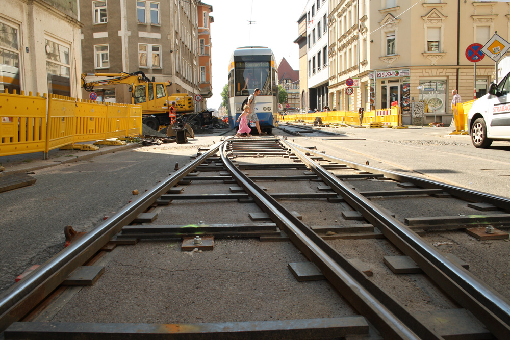 Tatsächlich geht es nicht nur um ein paar erhöhte Bordsteinkanten. Auf 200 Meter musste, wenn man es richtig machen wollte, das Gleisbett komplett erneuert werden. Auch die Wasserwerke mussten ran. Der Umbau sollte kein Provisorium werden, sondern im Grunde der Anfang für die in den nächsten Jahren geplante stückweite Aufwertung der Straße. Zwischen Prießnitz- und Klopstockstraße wurde die Straße völlig neu gebaut. Die Straßenbahn fährt eingleisig durch die Baustelle. Dabei rumpelt sie nicht über ein fest verbautes Gleiskreuz, wie man das zum Beispiel aus der “KarLi” kennt, sondern fährt ganz langsam über ein auf den Asphalt gelegtes Verbindungsstück.