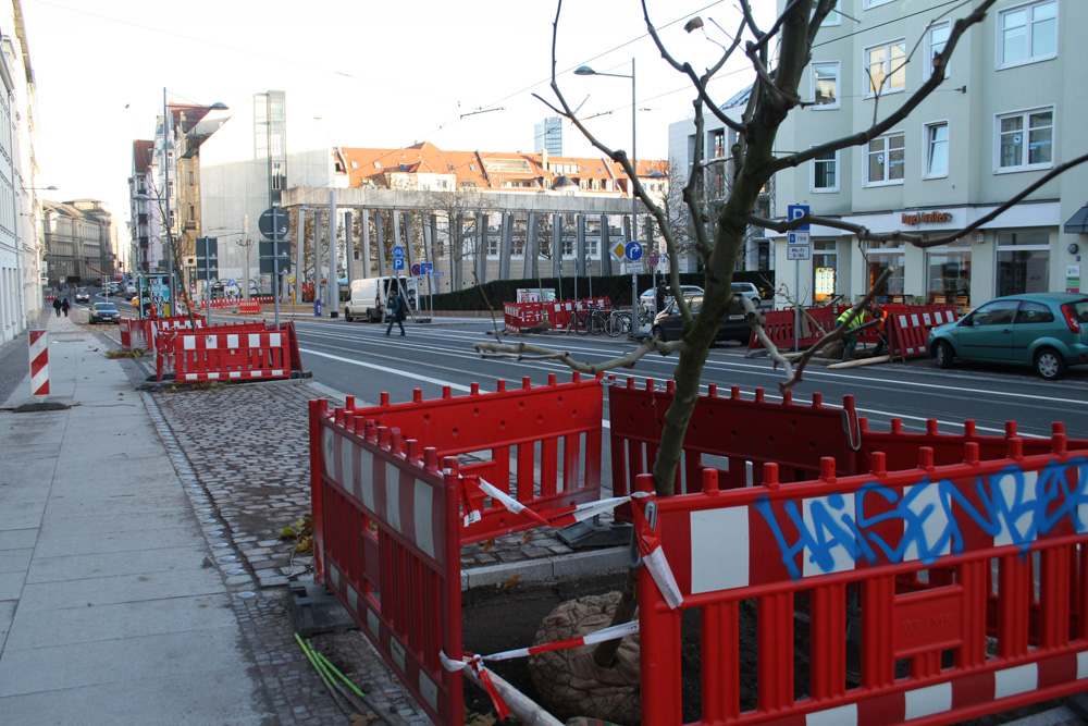 Nachtrag Montag, 16. November: Die Ampel, die an der Haltestelle Hohe Straße die Zufahrt der Kraftfahrzeuge regelt, ist jetzt in Betrieb. In Betrieb ist jetzt auch die neue Ampel an der Shakespearestraße, die jetzt für einen weiteren Stopp der Straßenbahn sorgt. Die Pflasterarbeiten an der Härtelstraße laufen noch und auch die Baumarbeiten sind noch nicht beendet. Und der Fußweg an der Probsteikirche wird noch einige Tage brauchen bis zur Fertigstellung.