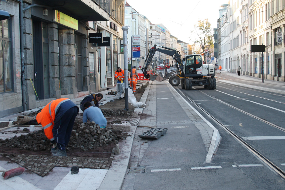 Am Samstag, 14. November, war natürlich noch nicht alles fertig. Erst am Tag zuvor waren die neuen Platanen für die Straße angeliefert worden. Die wurden jetzt noch ordentlich verpflanzt. Rund um die neu gebaute Haltestelle an der Münzgasse und an der Härtelstraße waren die Pflasterarbeiten noch im Gang. Das sollte dann am Montag alles fertig sein, genauso wie der Rest des Peterssteinwegs bis zum Martin-Luther-Ring, den man gern vergisst, wenn man von der “Karli” redet, denn die eigentliche Karl-Liebknecht-Straße endet ja an der Emilienstraße. Das wird ab jetzt kaum noch auffallen, denn der historische Straßenknick ist durch die Neuverschwenkung der Straße fast unsichtbar geworden. Wo vorher ein undefiniert breites Straßenstück vor “Bagel Brothers” zum Doppelparken einlud, sind jetzt auch ordentliche Parktaschen entstanden.