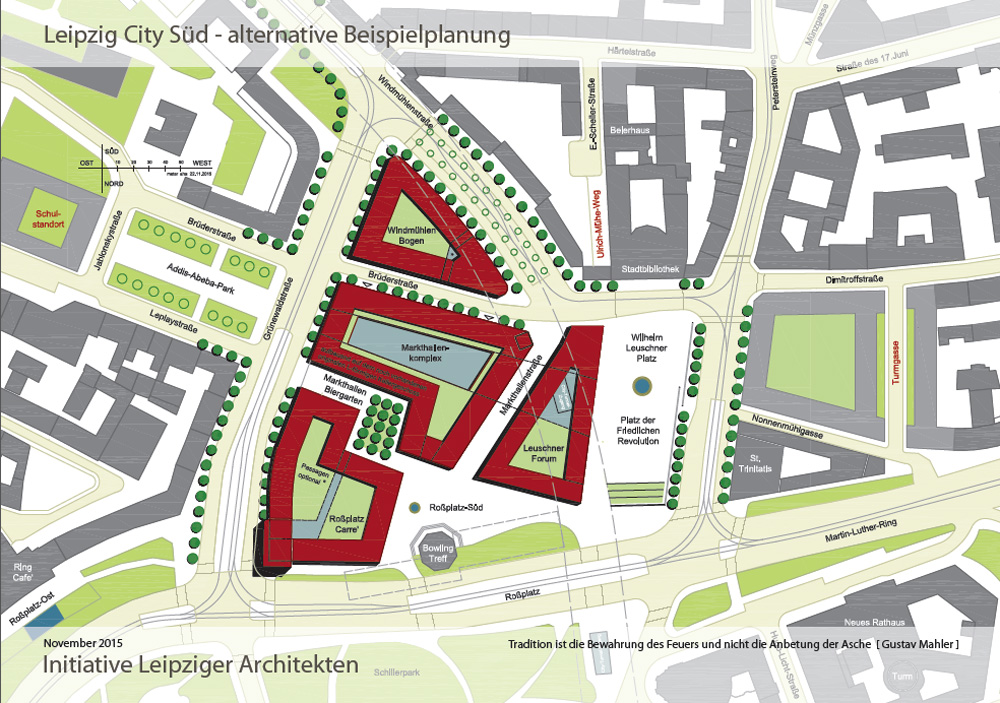 “Im Gegensatz zu dem 2010 entstandenen Entwurf für den Bebauungsplan 392, der mit Blick auf das seinerzeit geplante Freiheitsdenkmal eine konturlose und überdimensionierte Platzfläche vorsieht, schlägt die Initiative Leipziger Architekten ein lebendiges Stadtviertel (City Süd) als Bindeglied zwischen Innenstadt und Südvorstadt vor”, heißt es in einer Mitteilung der verschiedenen beteiligten Architektenverbände.