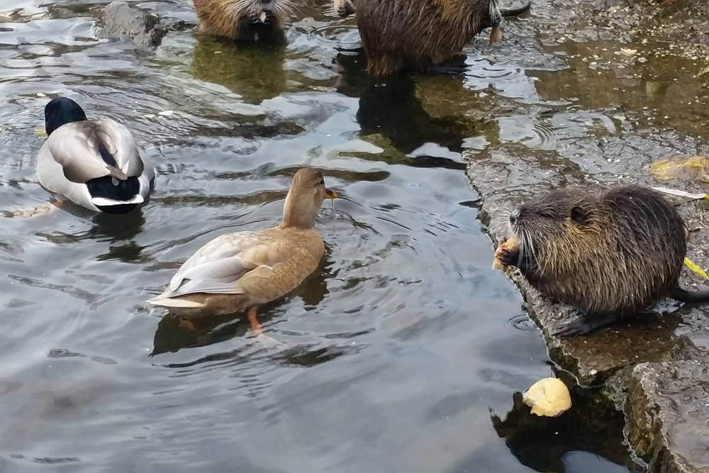 Wie das Foto zeigt: Auch Nutrias fressen gern Brötchen, wenn man sie ihnen hinschmeißt. Schwimmen können sie genauso gut wie die Enten. Und gebalgt wird sich um das Fressen auch nicht, denn es kommt ja immer neuer Nachschub geflogen.