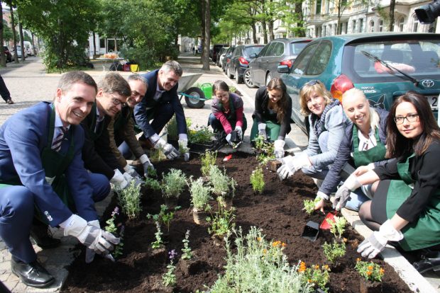 Die Bäume gibt es erst im November, wenn alles fertig ist. Doch die Gewerbetreibenden auf der Könneritzstraße wollen so lange nicht warten. Am Donnerstag, 19. Mai, nutzten sie die Gelegenheit, mit Pressepräsenz die noch leeren Baumscheiben auf dem neu gestalteten Stadtplatz an der Einfahrt zur Brockhausstraße mit Blumen zu bepflanzen.