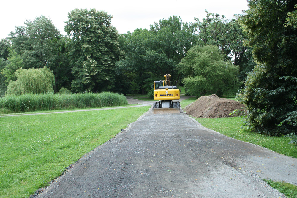 Die dicke Schotterschicht soll vor allem dafür sorgen, dass die Parkwege nicht zerfahren werden: „Die Tragschichten der historischen Wege werden genutzt, diese werden ertüchtigt und ggf. verbreitert. In Bereichen ohne vorhandene Befestigung, wird diese erneuert. Auf allen Wegen wird eine 5 cm starke Deckschicht in der Körnung 0/16 aufgebracht. Dies entspricht dem geforderten Wegeaufbau der Richtlinie für ländliche Wege (RLW). Die unmittelbar am Weg stehenden Bäume erhalten einen Stammschutz. Zur Orientierung der Parkbenutzer (Besucher und Radfahrer) und für Fahrzeuge werden Hinweisschilder aufgestellt.“