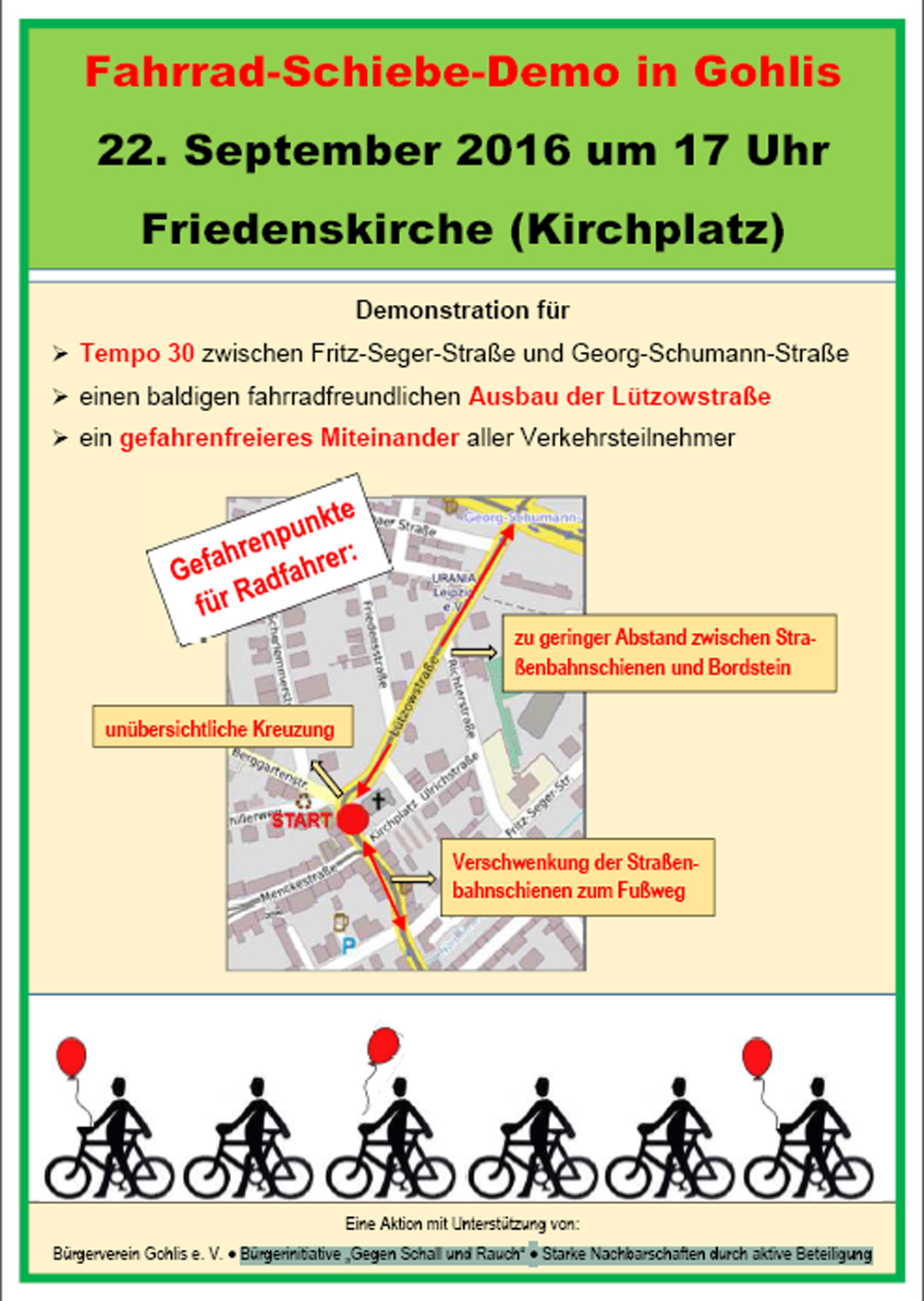 „Seit Jahren beklagen sich die Gohliser bei der Stadt Leipzig über den starken Autoverkehr auf Kosten der Fußgänger und Fahrradfahrer in der Lützow- und Gohliser Straße. Aber dort wird dieser Zustand anscheinend tatenlos hingenommen“, ärgert sich der Gohliser Matthias Weidel, der selbst ein passionierter Radfahrer ist. Deshalb hat er zu der Demonstration aufgerufen und wird dabei vom Bürgerverein Gohlis e. V., der Bürgerinitiative „Gegen Schall und Rauch“ sowie dem Bürgerprojekt „Starke Nachbarschaften durch aktive Beteiligung“ unterstützt.