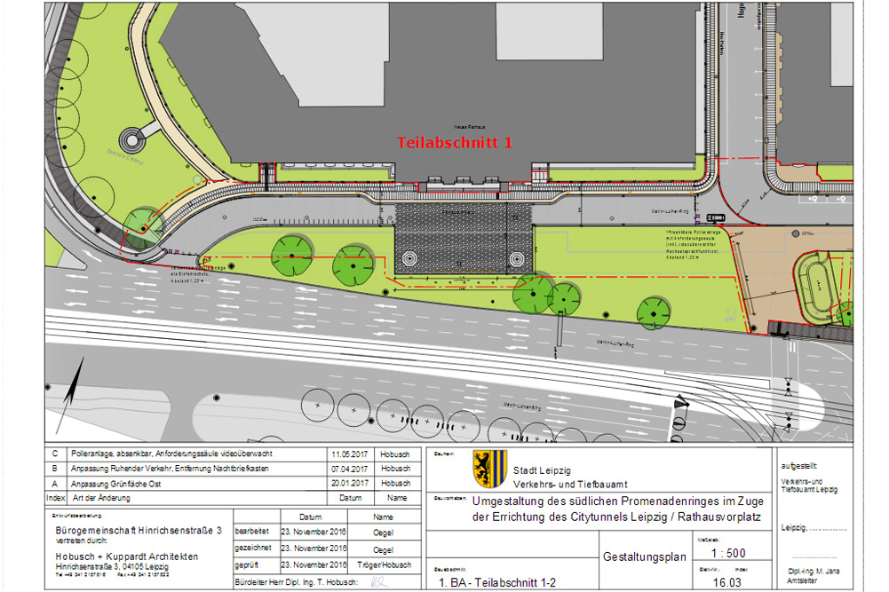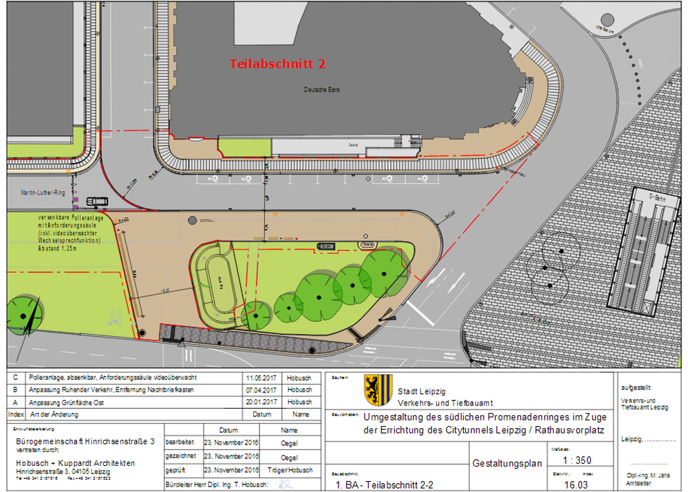 „Die Trassierung der Verkehrsanlage Martin-Luther-Ring basiert auf einer Entwurfsgeschwindigkeit von 20 km/h. Für die Rathausvorfahrt, einschließlich des Rathausvorplatzes, wird von Schrittgeschwindigkeit ausgegangen. Die bestehende Bordführung entlang der Bebauung wird mit Ausnahme des Bereiches vor dem Hauptportal beibehalten. Diese Gehwegflächen werden unter weitgehendem Verbleib der vorhandenen Gehwegbefestigung erneuert. Die östliche Kurvenausrundung der Hugo-Licht-Straße wird zugunsten der Fußgängerquerung verbessert. Die Bordführung auf der Stadtgrünseite wird neu konzipiert. Die Borde sind im Abstand von 7,50 m Breite parallel zum nördlichen Bord einzubauen. Im Abschnitt vor der Deutschen Bank wird parallel zur Fahrbahn ein promenadenbreiter Gehweg in neuer Lage unter südlicher Begrenzung durch die historische Einfriedung der Promenadenanlage angelegt. Eine Ausweitung der Grünfläche zulasten des Gehweges an dieser Stelle wurde vom Landesamt für Denkmalpflege Sachsen abgelehnt.“