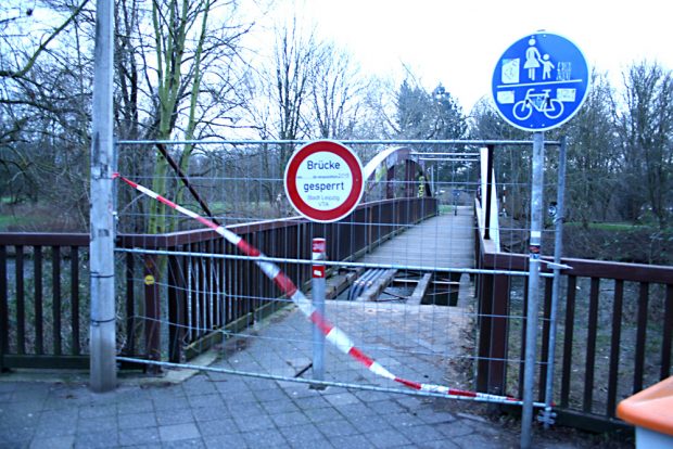 Im November 2017 hatte jedoch die turnusmäßige jährliche Überprüfung ergeben, dass die 1995 aus Brettschichtenholz errichtete Bogenbrücke durch einen Pilz, den Tannen- und Zaunblättling, stark geschädigt ist und eine Gefahr darstellt. Deshalb muss die Brücke bis zum Neubau gesperrt bleiben.