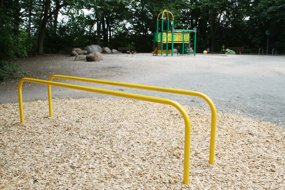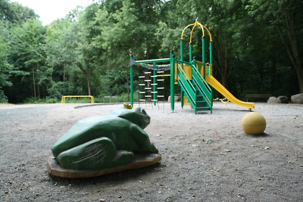 Und der Barren steht etwas abseits auf einer Fläche mit Holzspänen, damit man als ungelenkiger Erwachsener nicht so hart fällt, wenn die Turnübung nicht mehr so klappt. Noch ein paar Radbügel. Und ansonsten die alten, robusten Bänke und Steine, auf denen Eltern sitzen können, wenn sie ihren Kleinen beim Spielen zuschauen. Oder einfach das neueste Froschkonzert in C-Dur, opus 2018 genießen.