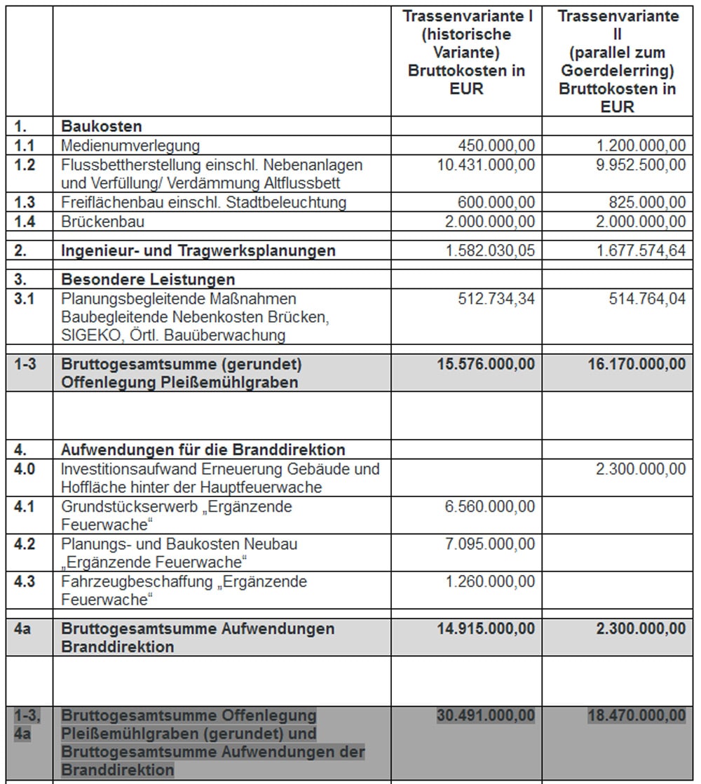 „Zudem ist sie funktional und finanziell letztlich gegenüber der Wiederherstellung des alten Gewässerverlaufs im derzeit teilweise verfüllten Flussbett des Pleißemühlgrabens hinter der Hauptfeuerwache und der IHK die Variante, die deutlich weniger Steuergelder benötigt. Die Freilegung im alten Verlauf würde mit Gesamtkosten von rund 30, 5 Millionen Euro zu Buche schlagen, für den Verlauf am Goerdelerring werden etwa 18,5 Millionen Euro veranschlagt.“