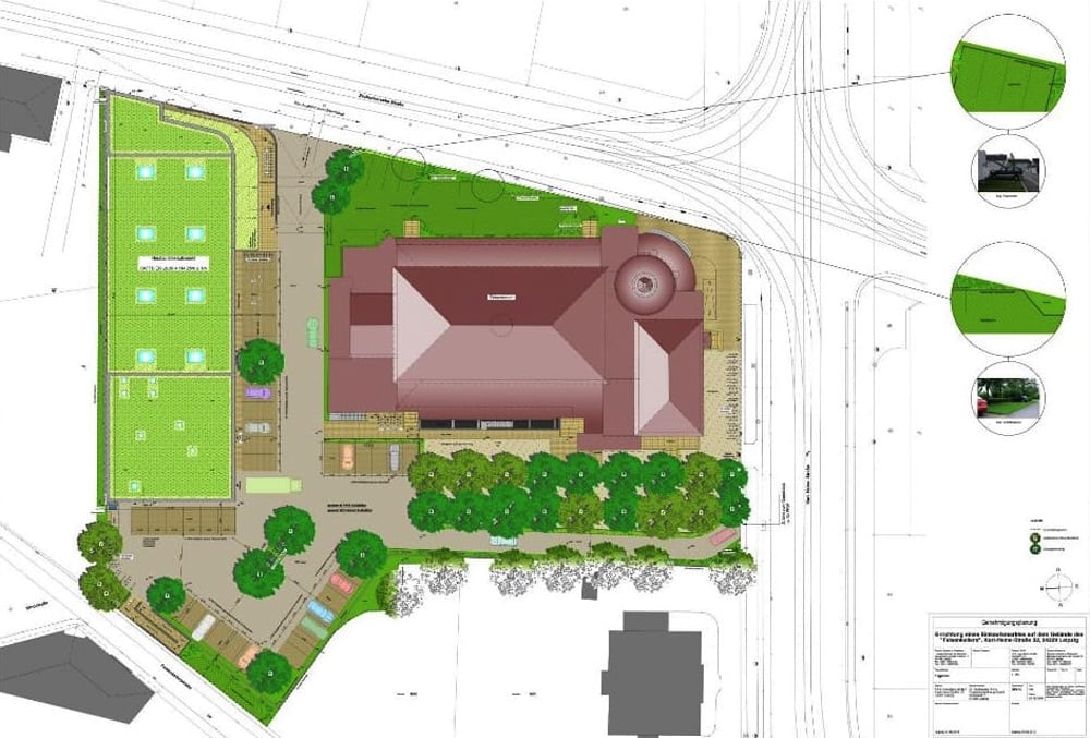 So sollte das Gelände nach dem Umbau eigentlich aussehen: Grün an derf Zschocherschgen Straße,Bäume und Grün auf der Parkfläche. Grafik: S&G Developement