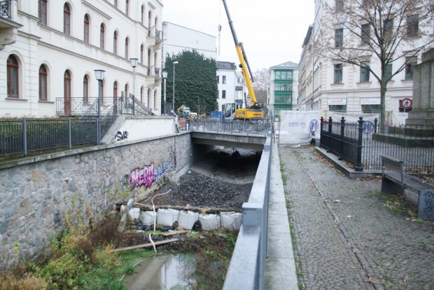 Eigentlich sollte das kleine, 85 Meter lange Teilstück des Elstermühlgrabens zwischen Lessingstraße und Thomasiusstraße in den beiden Jahren 2016/2017 flugs geöffnet werden. 3,4 Millionen Euro sollte es kosten, die Funkenburgbrücke im Verlauf der Thomasiusstraße sollte auch gleich mit erneuert werden. Doch schon 2017 deuteten sich erste Verzögerungen an. Und die Kosten erhöhten sich auch.