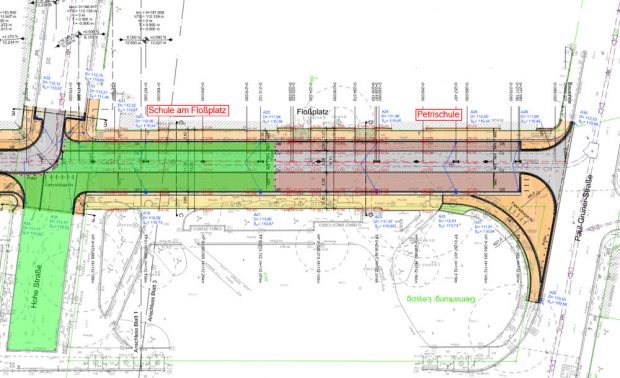 „Im Zuge der Voruntersuchungen wurde auch die Erweiterung des Schulhofes für die zwei angrenzenden Schulen untersucht“, heißt es da. „Im Ergebnis ist eine Erweiterung nicht möglich. Um die Aufenthaltsqualität im unmittelbaren Schulumfeld zu gewährleisten und die Schulwegsicherheit zu erhöhen, wird ein Bereich im Floßplatz vor der ‚Schule am Floßplatz‘ sowie der Stich Hohe Straße dem Kfz-Verkehr entzogen. Die abgepollerten Bereiche werden ausschließlich dem Fuß- und Radverkehr zur Verfügung stehen. Diese Mischverkehrsfläche mit ausgegliedertem Kfz-Verkehr kann für Spiel und Sport genutzt werden.“