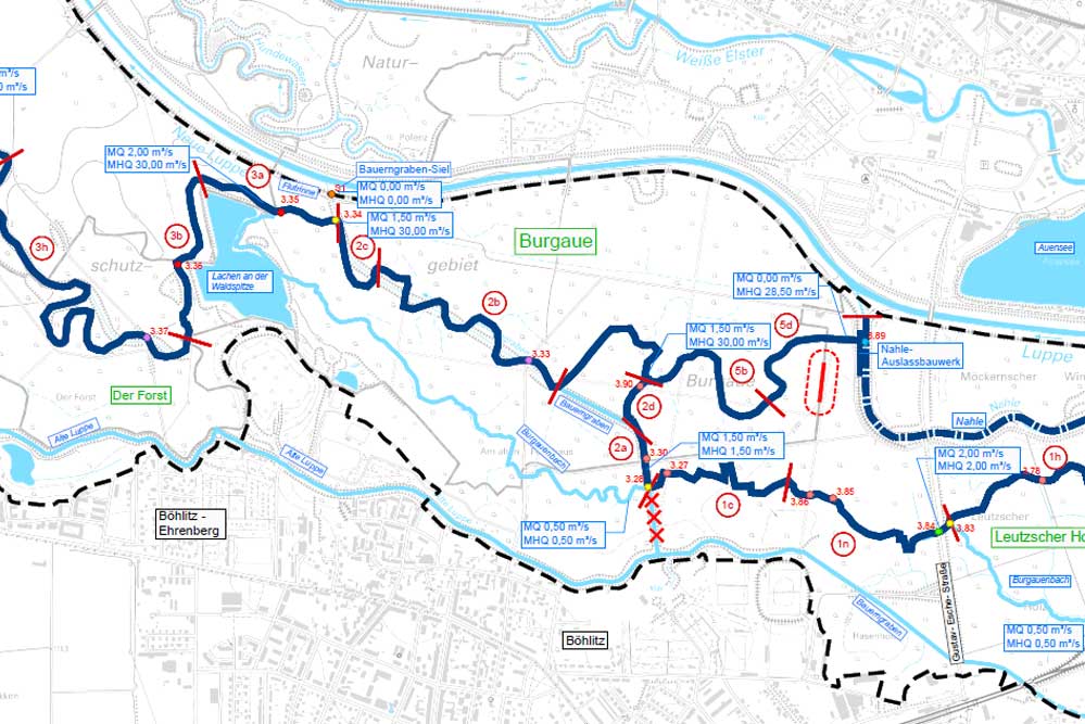 „die Revitalisierung der Fließgewässer im nordwestlichen Auwald im Einklang mit der Europäischen Wasserrahmenrichtlinie (WRRL) als Baustein eines durchgängigen, auentypischen Fließgewässernetzes zwischen dem Speisungspunkt bis Einbindung in das Luppewildbett,