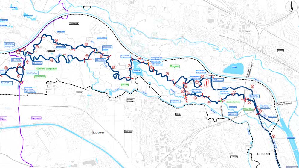Zum Scopingtermin machte dann die Landesdirektion deutlich, dass die Anlage eines neuen künstlichen Bachverlaufs in einem Gebiet, in dem überall noch die alten Flussverläufe des Luppesystems zu sehen sind, keinen Sinn machte. Und das gewählte Gebiet, das künftig wieder (künstliche) Überflutungen bekommen sollte, war viel zu klein gewählt. Es könne nicht darum gehen, die Burgaue ein bisschen zu vernässen. Wenn so ein Projekt geplant würde, müsste die komplette Nordwestaue und ihre gesamte Funktionsfähigkeit mitgedacht werden.