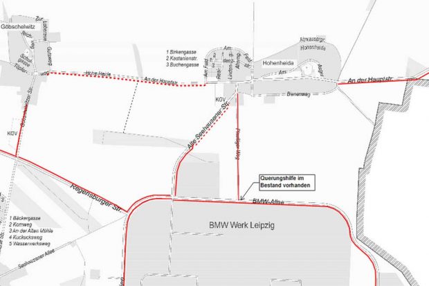 Wobei Radfahrer – so sieht es zumindest das Planungsdezernat – auch jetzt schon von Göbschelwitz bis zum BMW-Werk kommen – über die Göbschelwitzer Straße und die Regensburger Straße zur BMW-Allee. Über den Plaußiger Weg kommt man auch von Hohenheida direkt zum BMW-Werk.