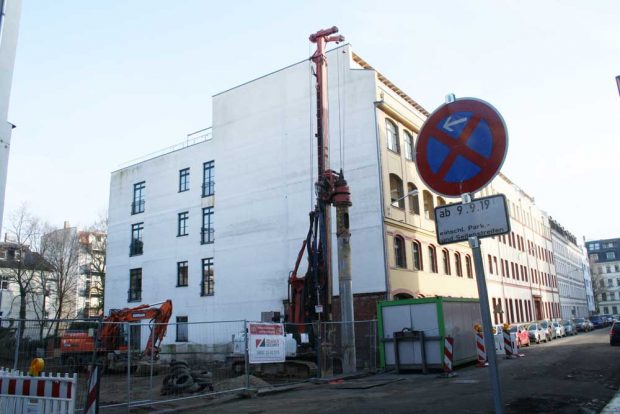 Die Baustelle ruht, der Boden ist wieder planiert. Am Rand stehen noch die großen Röhren, die hier in den Boden gerammt werden sollten. Doch unverhofft kam zumindest ein vorübergehender Stopp. Denn in der Vorwoche sind am Nachbarhaus Erdmannstraße 12 in Plagwitz Risse im Mauerwerk aufgetreten. Eine Geschichte, die im Februar 2019 begann, nimmt eine neue, nun doch etwas unerwartete Wendung. Eine Geschichte, die eigentlich schon 2004 begann.