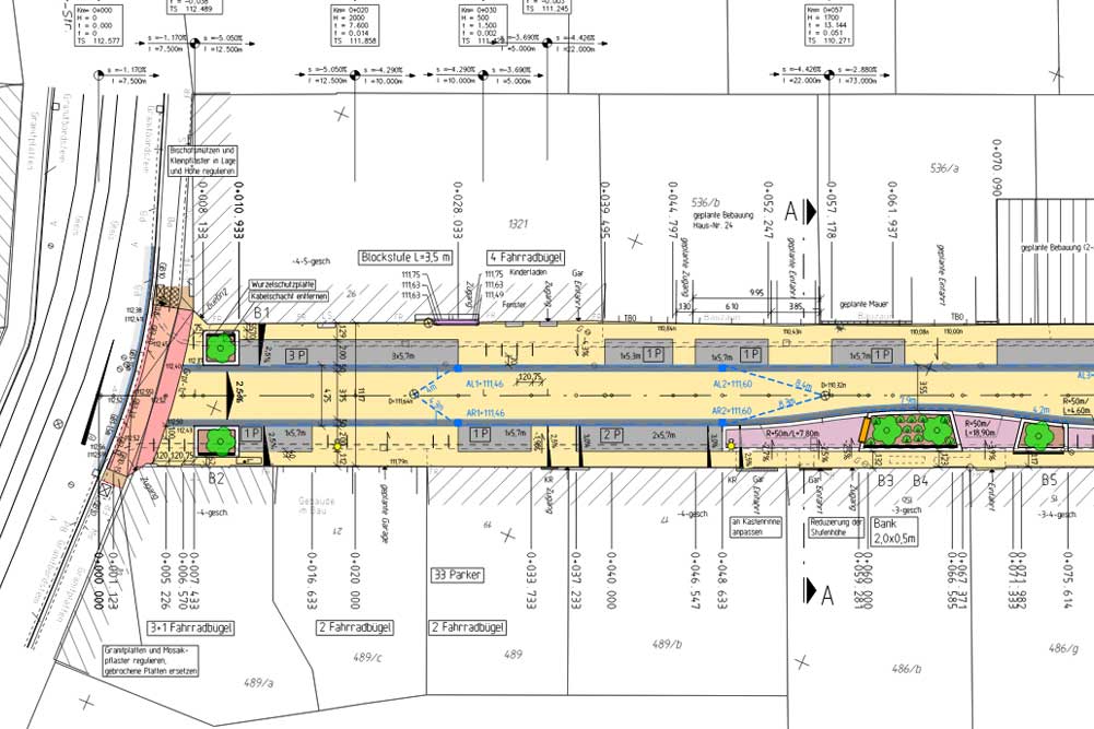 – Ausbau des gesamten Fahrbahnbereiches in Pflasterbauweise. Alle Flächen werden überfahrbar ausgebildet. Für die Pflasterung werden zwei verschiedene Pflasterformate mit unregelmäßigen Kanten und gealterter Oberfläche genutzt. In den Straßenrandbereichen werden beidseitig Parkflächen vorgesehen, welche durch die Farbgebung des Pflasters von der restlichen Verkehrsfläche abgegrenzt werden.