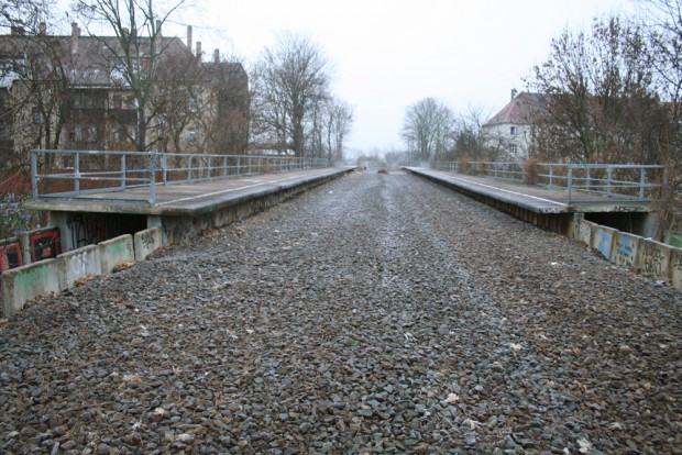 Auf dem Foto sieht es so aus, als verlaufe das alte Gleisbett auf dem Sellerhäuser Bahnbogen hier ins Unendliche. Aber tatsächlich führt das letzte Stück der stillgelegten Bahnstrecke hier noch einmal über eine mehr als 100 Jahre alte Brücke über der Eisenbahnstraße. Doch diese Brücke ist so marode, dass sie abgerissen werden muss. Noch bis zum 28. Februar wird die Querung an der Grenze zwischen Volkmarsdorf und Sellerhausen-Stünz bis auf die Widerlager abgerissen.