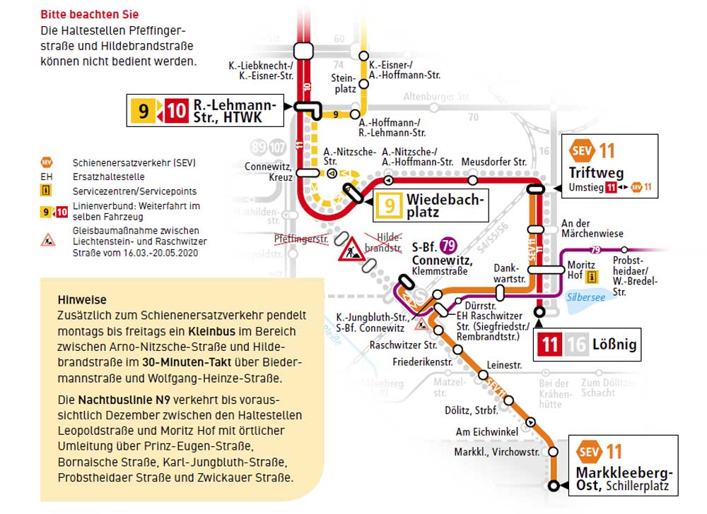 Dazu wird eine Schienenersatzverkehr-Linie mit Bussen eingerichtet, die am Triftweg starten (wo man aus der Linie 11 in den SEV umsteigen kann) und über Dankwartstraße, S-Bahnstation Connewitz und Dölitz nach Markkleeberg fahren.