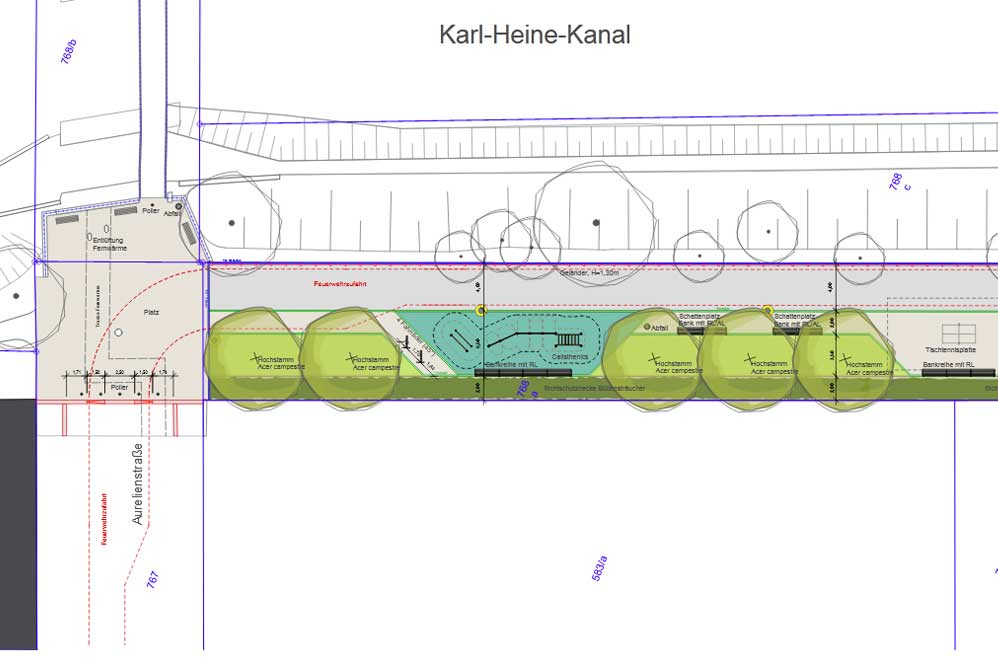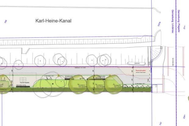 „Der 11 m breite Streifen befindet sich im Eigentum der Stadt – er liegt zwischen der Böschung des Karl-Heine-Kanals und sogenannten Jahrtausendfeld, auf dem gemäß Flächennutzungsplan eine Schulnutzung vorgesehen ist.“