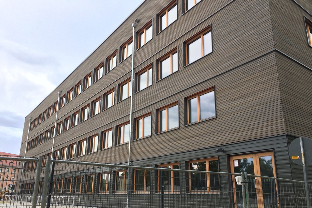 Auf dem ursprünglich für eine Gemeinschaftsunterkunft für Geflüchtete vorgesehenen Standort wurde eine vierzügige Oberschule errichtet. Besonderheit: Das Haus wurde in Holzmodulbauweise gebaut. Der Werkstoff Holz ist sowohl in der Fassade als auch in den Innenräumen mit hoher optischer und haptischer Qualität zu erleben. Die Verwendung von Massivholz ist ökologisch und nachhaltig.