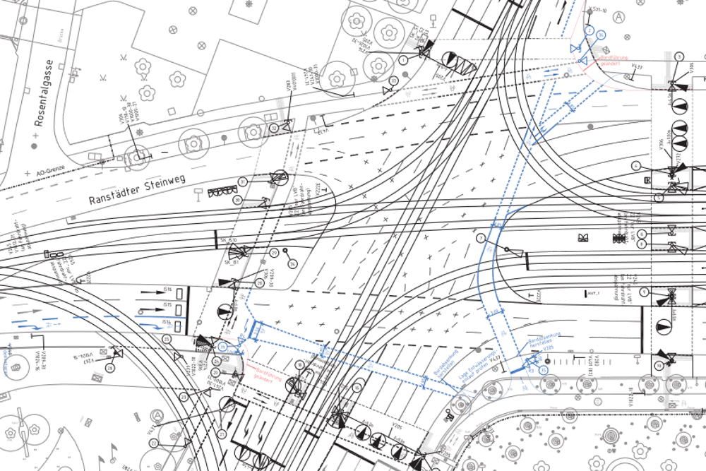 Schritt 1: es wird eine bauliche Maßnahme geplant (hier Umbau Haltestelle und Kreuzung Gördelerring)