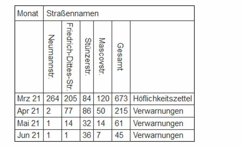 „Mit den Kontrollen und der Ahndung von Verstößen hat somit kein Abbau regulärer Parkplätze stattgefunden, sondern allein die Sanktionierung verbotswidrig abgestellter Fahrzeuge. Dazu wurden die Halterinnen und Halter solcher Fahrzeuge im März zunächst mit ‚Höflichkeitszetteln‘ auf die Verletzung der StVO hingewiesen; seit dem 08.04.2021 wird durch das Ordnungsamt nun ein Verwarngeld ausgesprochen.“
