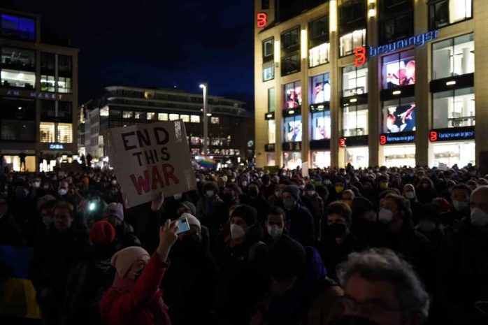 Weitere Redebeiträge folgten unter anderem von Vertreter/-innen der Jusos und der Grünen Jugend. Anselm Hartinger, Direktor des Stadtgeschichtlichen Museums, erklärte, dass die europäische Nachkriegsordnung mit dem heutigen Tag „ein Stück weit zerbrochen“ sei. Auch er wies darauf hin, dass der Feind nicht das russische Volk sei.