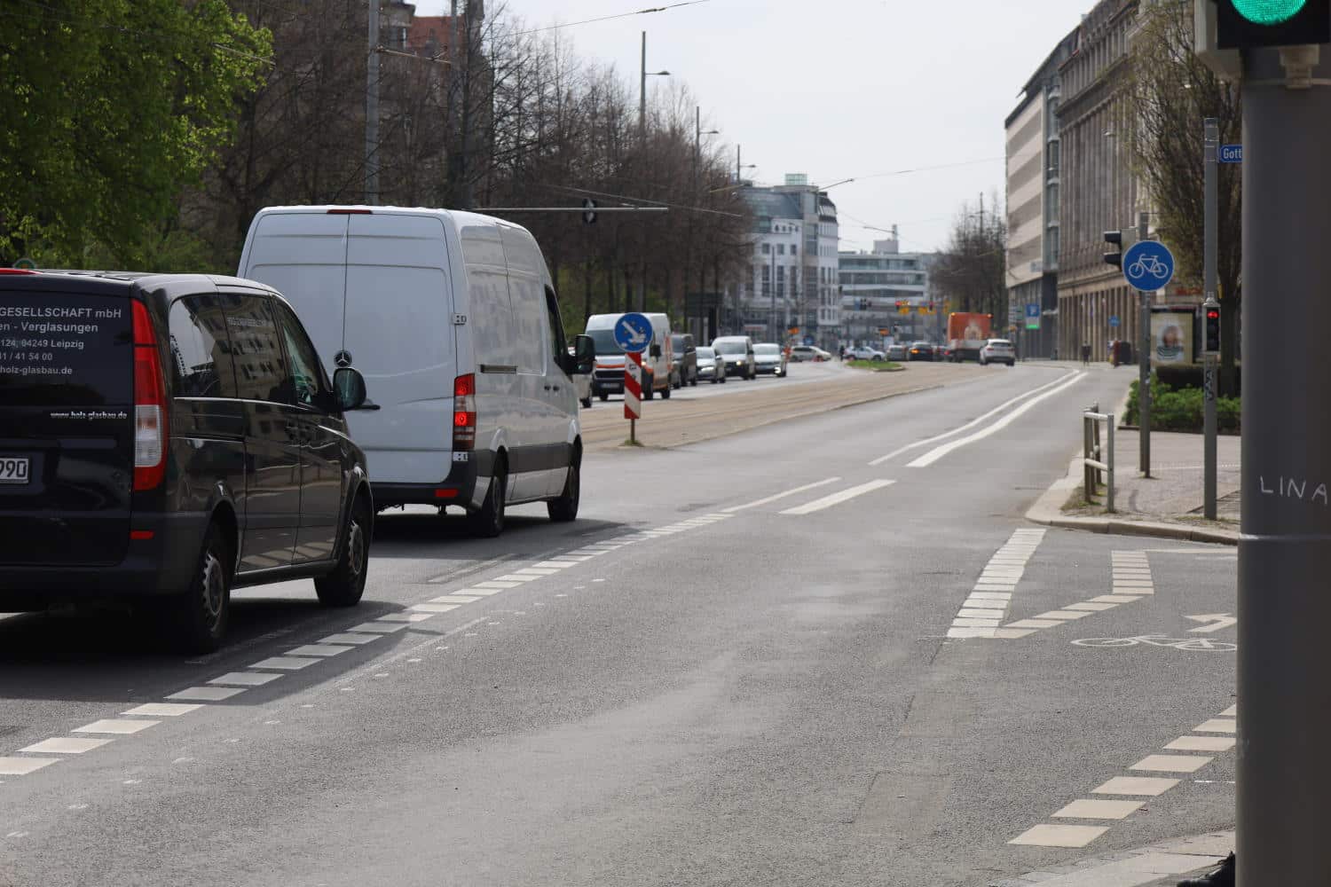 Das ist er auf der westlichen Seite des Dittrichrings bis zur Rudolphstraße nämlich nicht mehr. Für Radfahrer ist hier ein ganzer Fahrstreifen abmarkiert. Erst ab der Rudolphstraße müssen sie sich einordnen.