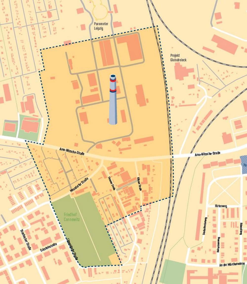 Ende des 19. Jahrhunderts entstand auf dem Gelände an der Arno-Nitzsche-Straße ein Gaswerk. Bis 1910 wurden vier Behälter errichtet, die für die Speicherung von Gas und den Druckausgleich im Rohrnetz sorgten. 1952 erhielt das Gaswerk den Namen Gaskokerei „Max Reimann.“ Von dieser Geschichte zeugen noch die beiden Gasometer-Bauten an der Richard-Lehmann-Straße. In einem davon hat ja seit 2003 das Panometer von Yadegar Asisi sein Zuhause gefunden.