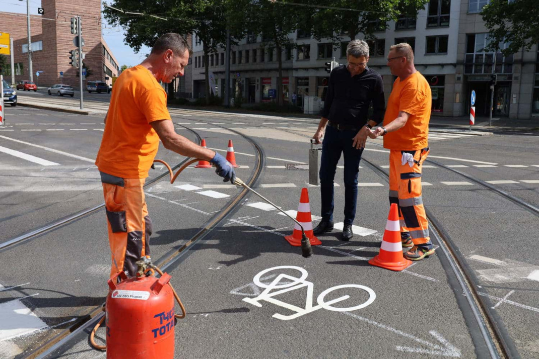 Das Komplizierteste daran, so Dienberg, sind gar nicht die Markierungsarbeiten, sondern die Ampelschaltungen. Wenn man dem Kfz-Verkehr eine Fahrspur wegnimmt und dort Radfahrer fahren lässt, müssen sich sämtliche Ampelphasen verändern.