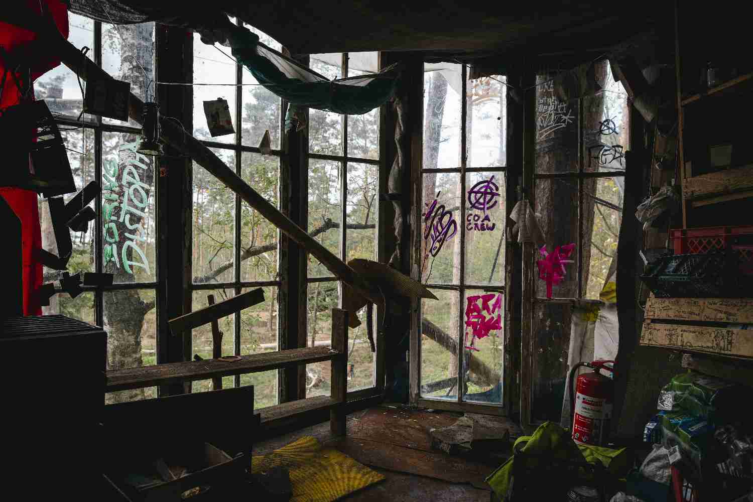 Aktivist/-innen haben hier aus Stämmen, Holzbrettern und Planen seitdem gut 15 Baumhäuser gebaut. Die meisten hängen fünf bis zehn Meter über dem Boden und sind über selbstgebaute Leitern oder Kletterseile zu erreichen. Kleinere Bauten dienen als Wohn- und Schlafräume, größere Baumhäuser als Materiallager oder Küche. Mit dicken Seilen aus Polypropylen, zwischen Kiefern eingebunden, schwingen sie im Wind hin und her.